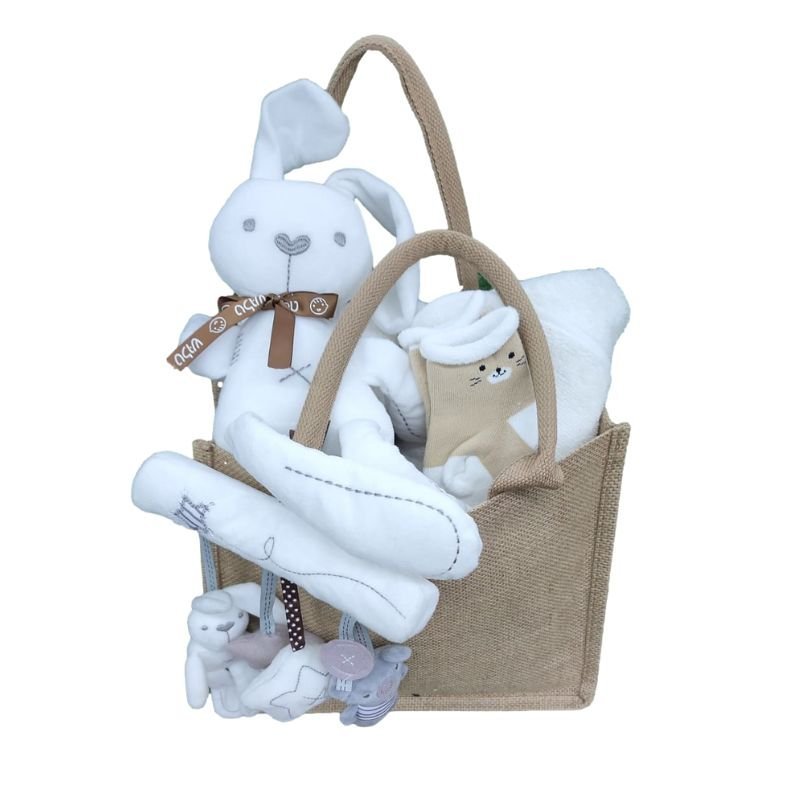 מתנה יוקרתית ושימושית מבית "טלוש": תיק קנבס שימושי ואופנתי ובתוכו מגבת קפוצ'ון רקומה, שמיכה עונתית, מובייל מנגן, בובת נבי ארנבי וגרביים מעוצבות. מתאים לתינוק ולתינוקת.